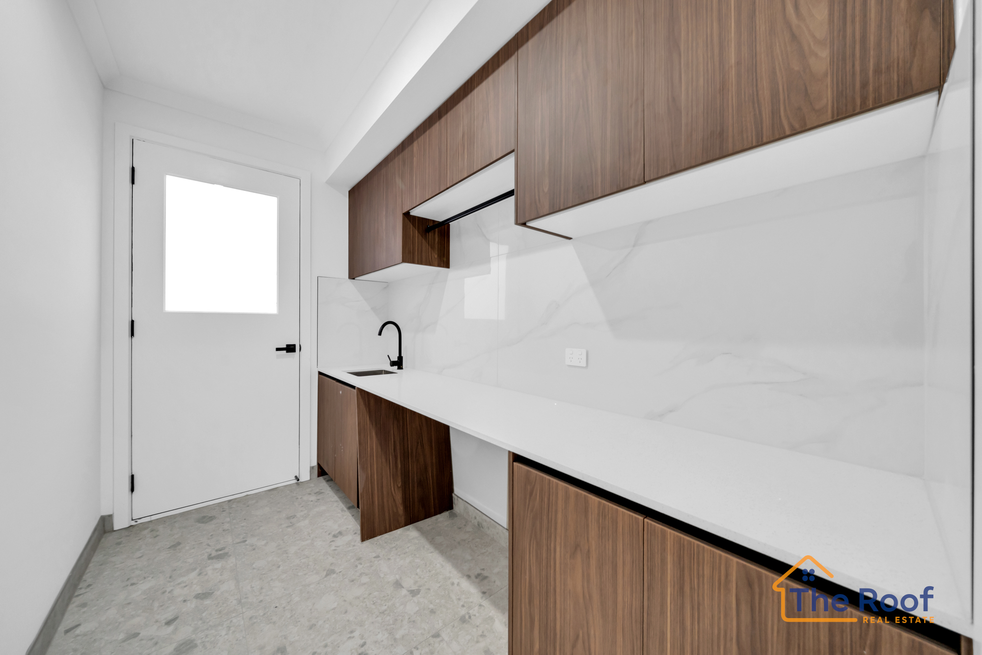 Laundry: 20mm Stone benchtop with Single Sink , black fitting tab wear , Ample linen storage with shelving , washing machine and dryer Space , glass door fitted access to outdoor .